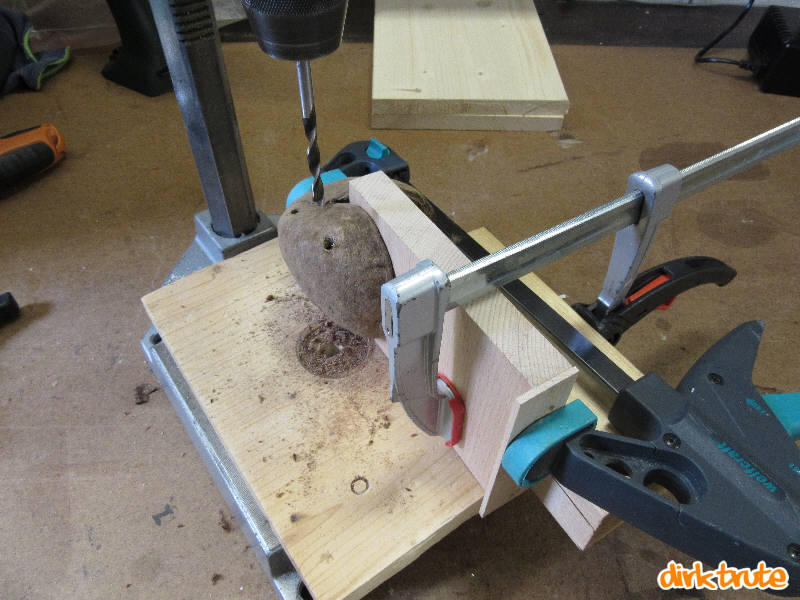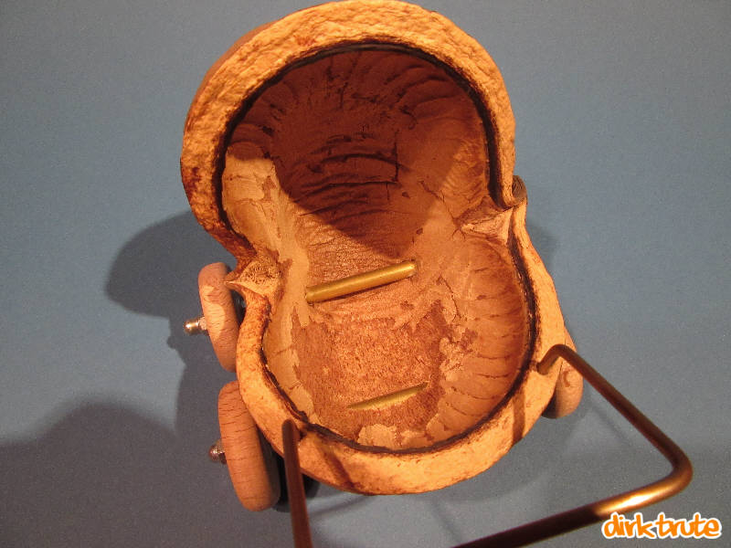 Als erstes müssen Sie sich etwas bauen um die Nussschale festzuspannen. Fachlich richtig wäre die Bezeichnung für “Etwas“ Vorrichtung. Praktisch genügen dann ein paar Stückchen Holz.