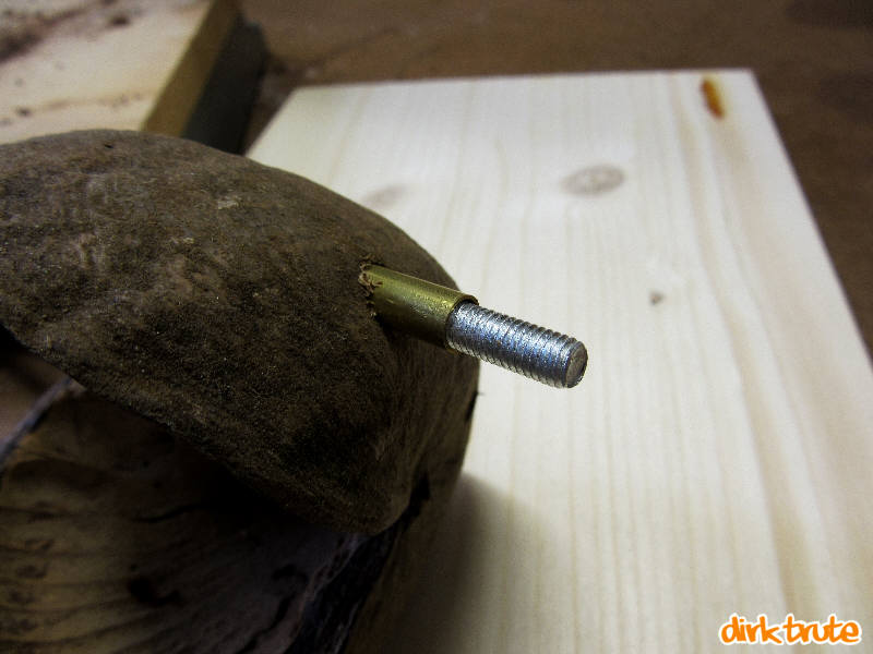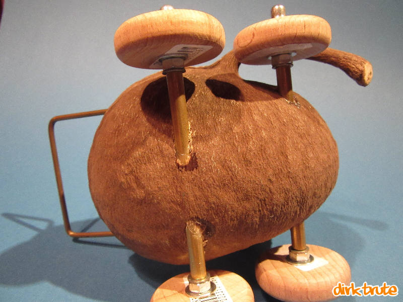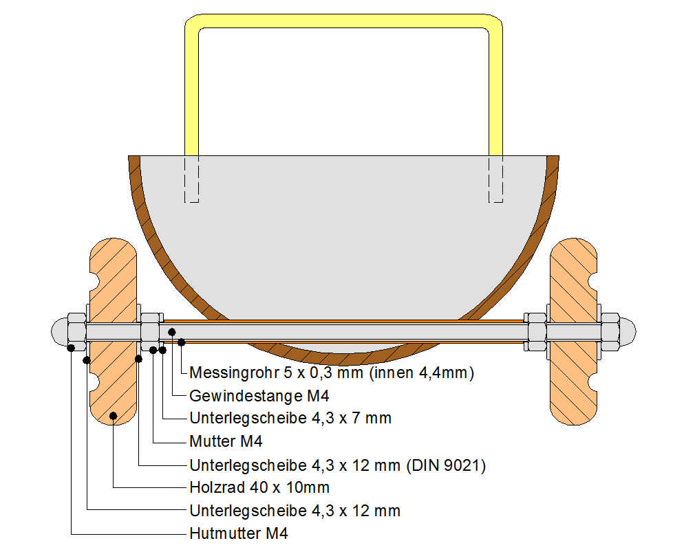 Damit die Gewindestange keine Langlöcher in die Nussschale fräst und aus dem Wägelchen kein Quietschwägelchen wird, bekamen die Gewindestangen Achslager aus 5mm Messingrohren. Rohre und Gewindestangen sind im Baumarkt in der Regel so dimensioniert, dass diese ineinander passen. Um den Wagen richtig schieben zu können habe ich eine Stange aus Messing-Rundmaterial gebogen. Dieses können Sie nicht im Baumarkt kaufen. Denn das dort Erhältliche ist meist nicht kalt verformbar und würde beim Versuch es zu biegen, sofort brechen. Meins stammte noch aus DDR-Zeiten. Im Modelbaubedarf sind aber kalt biegbare Messingstäbe erhältlich. Kalt und warm bezieht sich hier auf einen Temperaturunterschied von ein paarhundert °C. "Kalt" entspricht der Zimmertemperatur und zum Warmbiegen bräuchten Sie einen Brenner. Dies ist aber bei Messing auch nicht ganz unkompliziert, da nach weich gleich flüssig kommt.