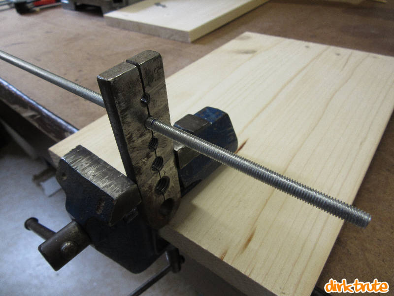 Nach dem absägen, die Schnittfläche gerade und glatt feilen und ringsherum eine Fase (Schräge an das Gewinde) anfeilen. Dann den Schraubstock etwas lösen. Soviel das man die Gewindestange drehen kann. Nun die Stange mit den soeben bearbeiteten Ende durch den Gewindehalter heraus schrauben. Das Gewinde im Halter entfernt die bei der Bearbeitung entstanden Grate und formt das Gewinde etwas nach. Es lässt sich, wenn man alles richtig gemacht hat, auf das abgesägte Ende ganz leicht eine Mutter aufschrauben.