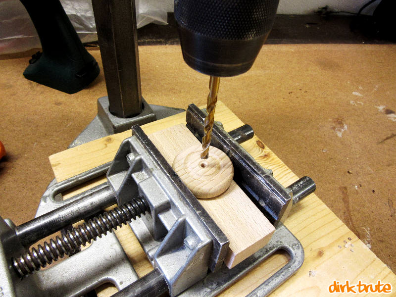 Dann bohren Sie an 2 Stellen die günstig sind, zwei Durchgangslöcher (eigentlich 4)mit dem 5mm Holzbohrer zur Aufnahme der Achsen.