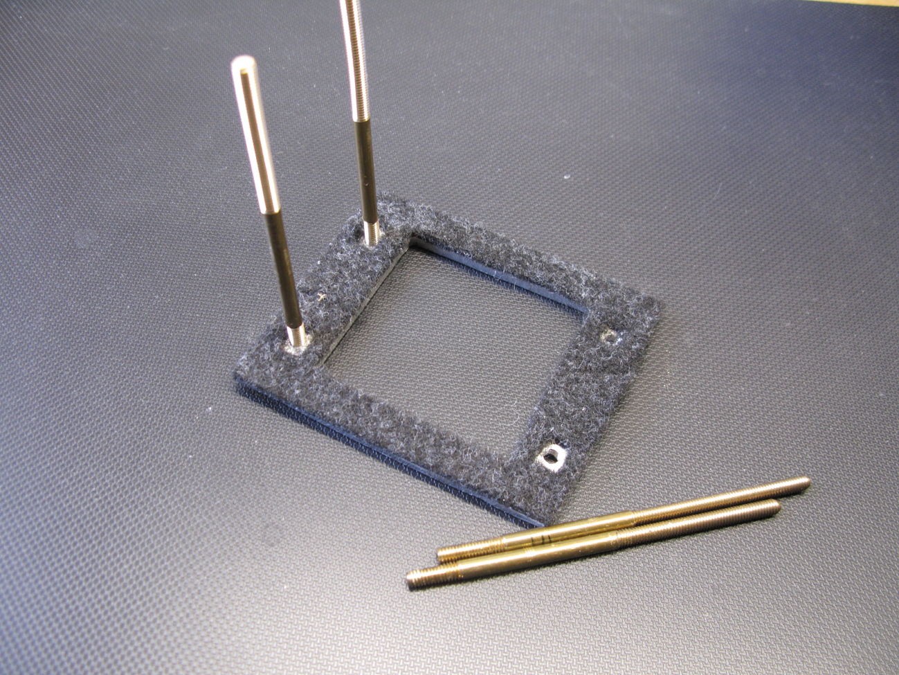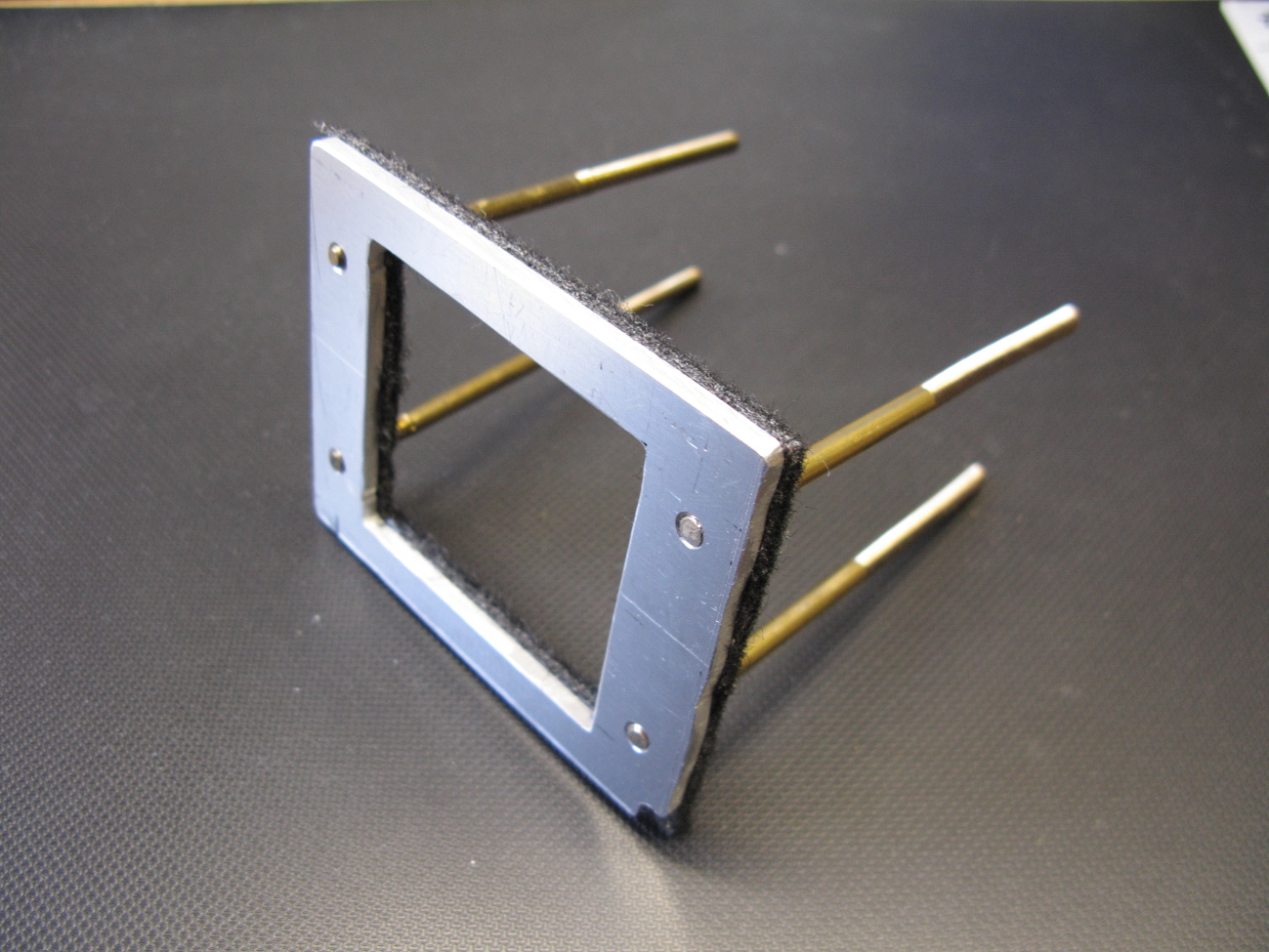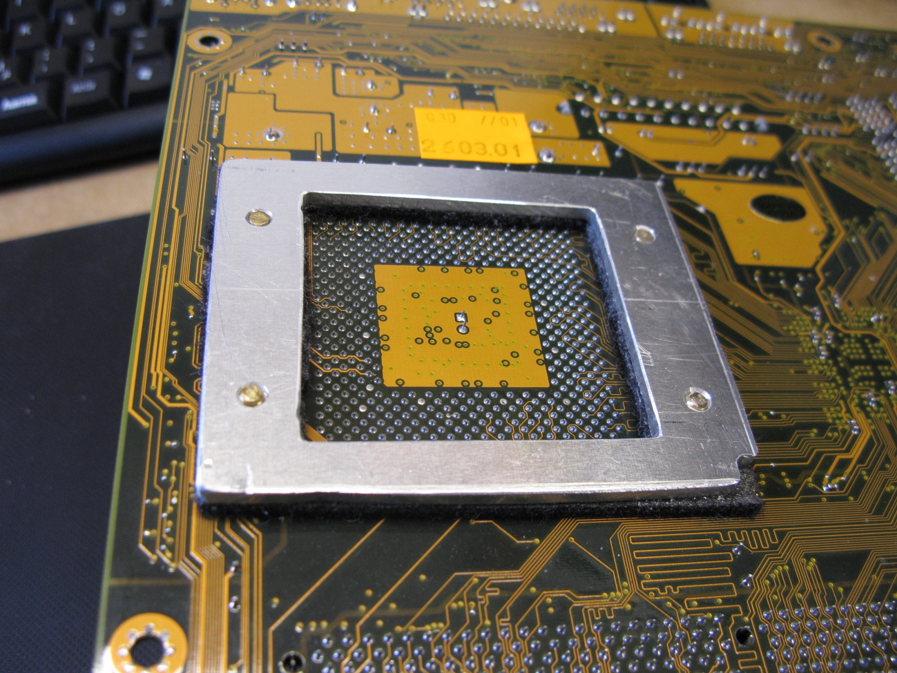 MontageEinige Mainboards dieser Zeit hatten rings um den Sockel 4 Löcher, die in der Spezifikation von AMD definiert waren. Kühler die diese Bohrungen im Mainboard nutzten, sind mir nicht bekannt. Zur Befestigung des Wasserkühlers wollte ich diese Bohrungen nutzen. Da ein hoher, wenn auch unbekannter, Anpressdruck zwischen CPU und Kühlkörper erforderlich ist, werden diese Kräfte auf das Mainboard abgeleitet. Um dieses nicht zu beschädigen, konstruierte ich eine Gegenplatte zu Lastverteilung und zur Verminderung der Biegebeanspruchung. Heute heißt das Backplate und ist Standard. Die Platte besteht aus 2mm dickem sehr harten Aluminiumblech. Stahl als Material wäre die bessere Wahl. In der Platte sind vier M4 Gewindebohrungen zur Aufnahme der Stehbolzen. Als Isolator dient ein Reststück Polyestervlies. Es ist wichtig das kein Kontakt zu Bauteilen und Kontakten des Mainboards besteht. Dies Gesamtdicke darf nicht mehr sein, als die Höhe der Abstandsbolzen zwischen Gehäuse und Board.