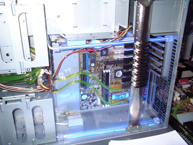 Damals, im Jahr 2001, hielt ich die fertige Konstruktion für sehr fortschrittlich. Deshalb suchte ich etwas halbherzig und leider vergeblich nach einem Investor um Wasserkühlungen für PC's herzustellen. Ich erhielt nur Kopfschütteln und Unverständnis. Vor allem die Sache mit dem offenen Ausgleichsbehälter, den Sie weiter unten sehen können, hatte ich bei den damals käuflichen Aquarienpumpen und Zimmerspringbrunnensystemen nicht finden können. Diese Anlagen mussten noch entlüftet werden, meine nicht. Also machte ich mir über Ideenklau Gedanken, zumindest bis auch andere darauf gekommen sind.