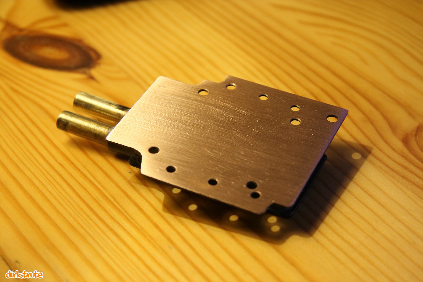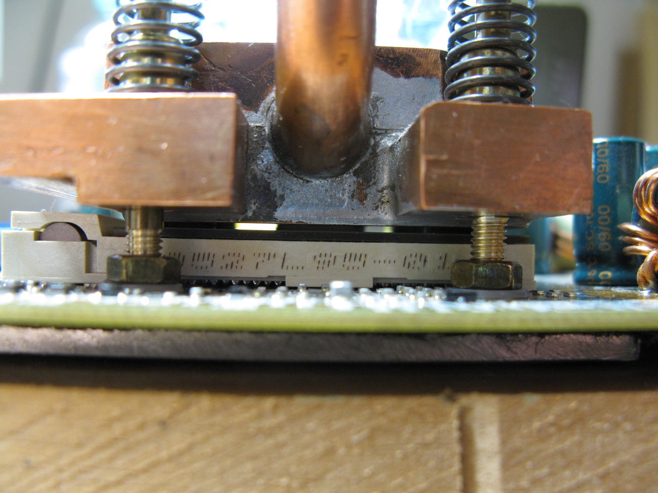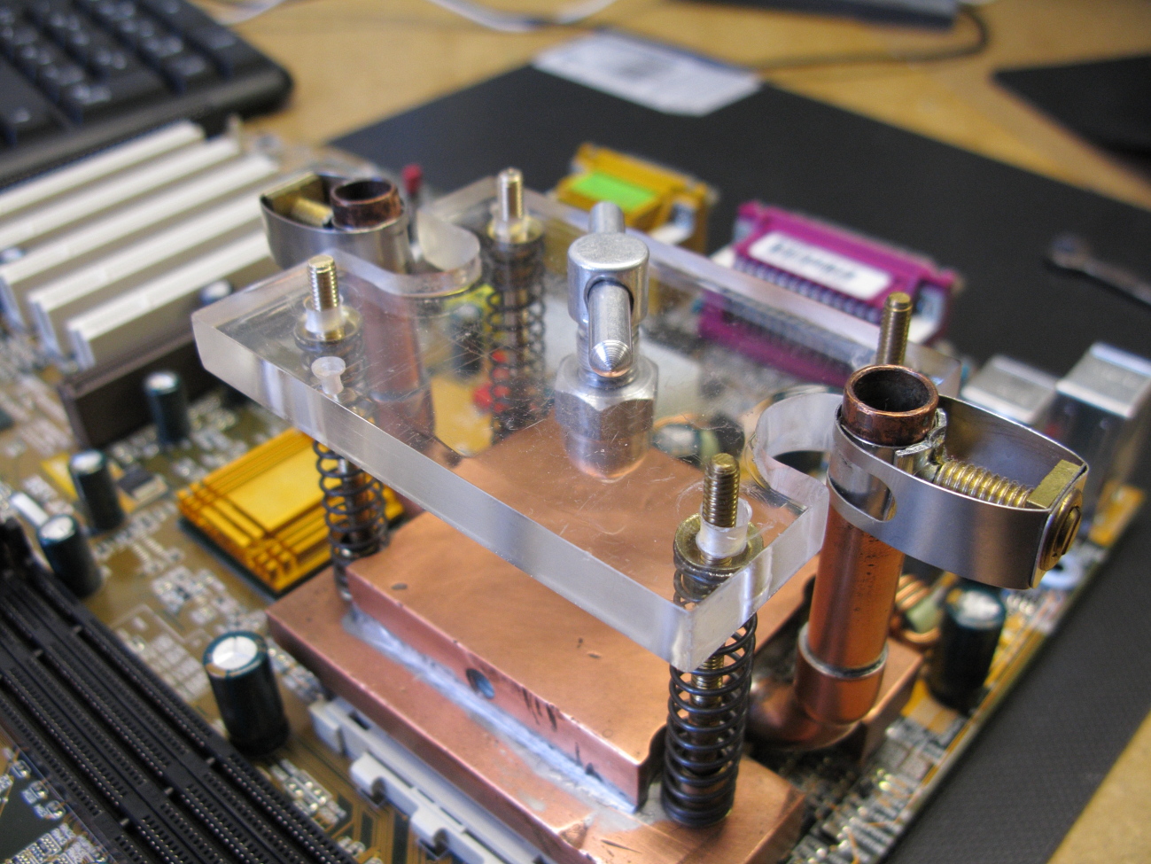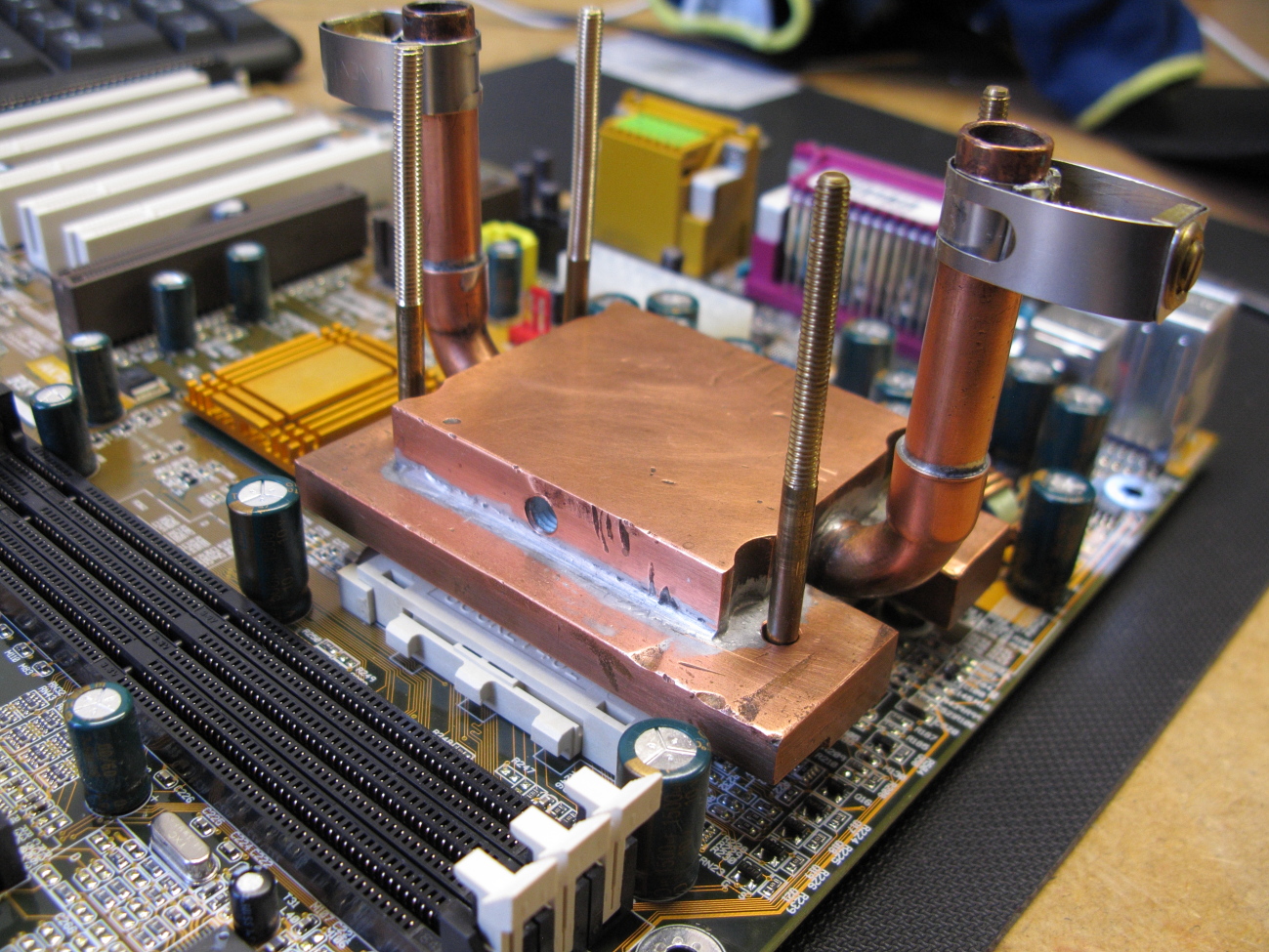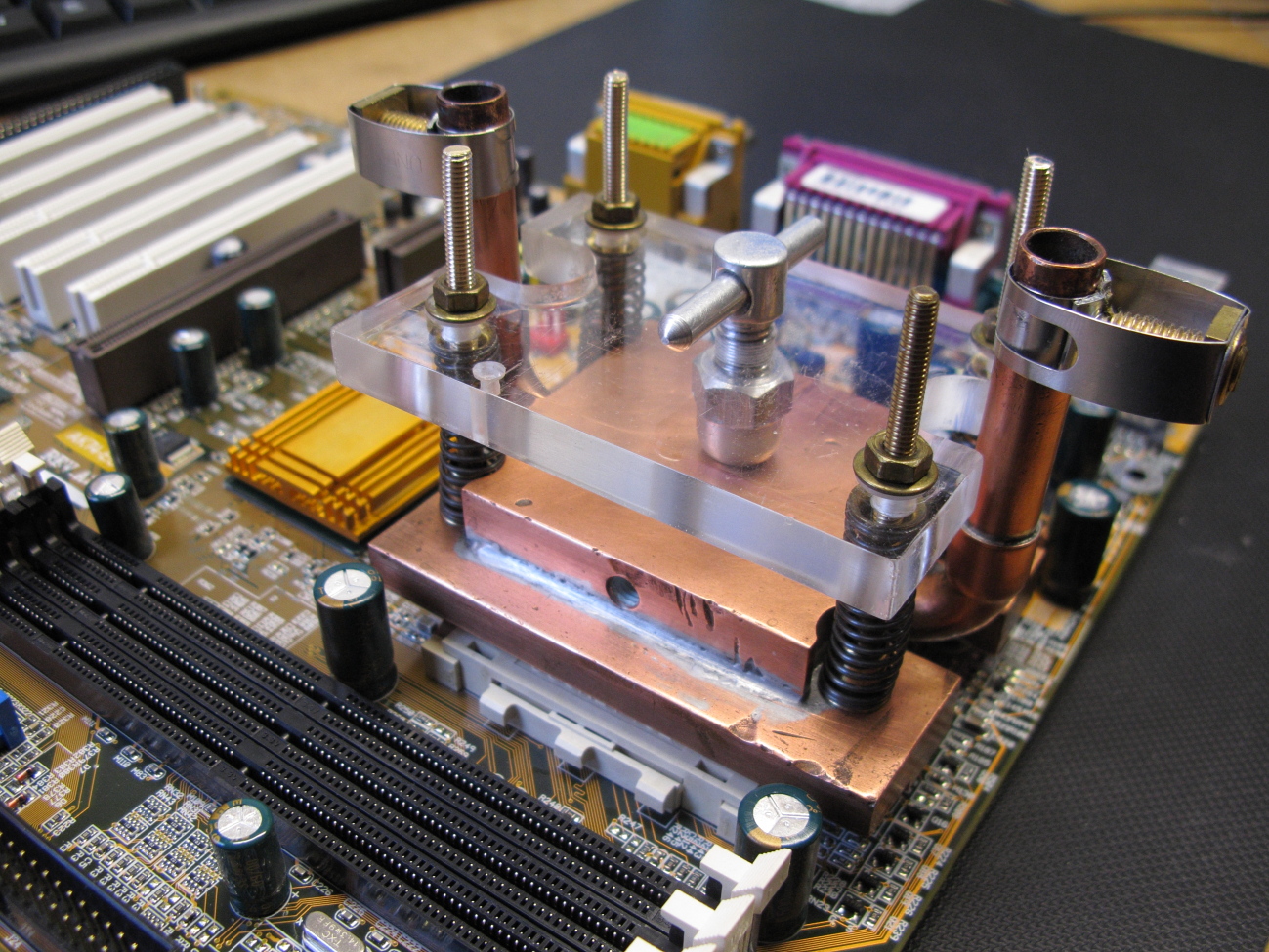 Mein Wasserkühler besteht aus einem möglichst ebenen Bodenblech, einem Stück Kupferrohr, einen in das Rohr passenden Deckel aus 3mm Messingblech und 2 Messingrohren mit 8mm Außendurchmesser. Auf dem Mainboard wurde der Kühler mit den Klammern des originalen Luftkühlers befestigt. Natürlich muss auch hier etwas Wärmeleitpaste darunter.