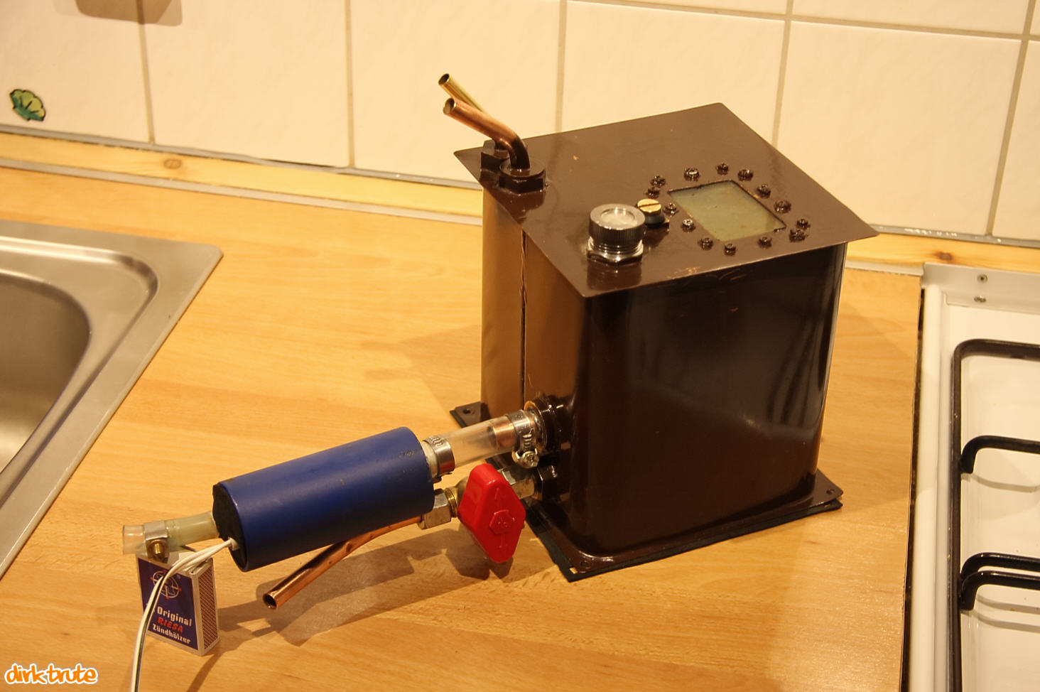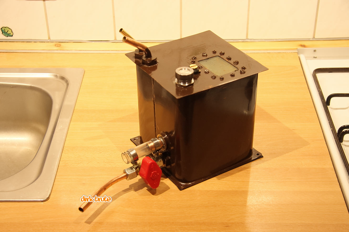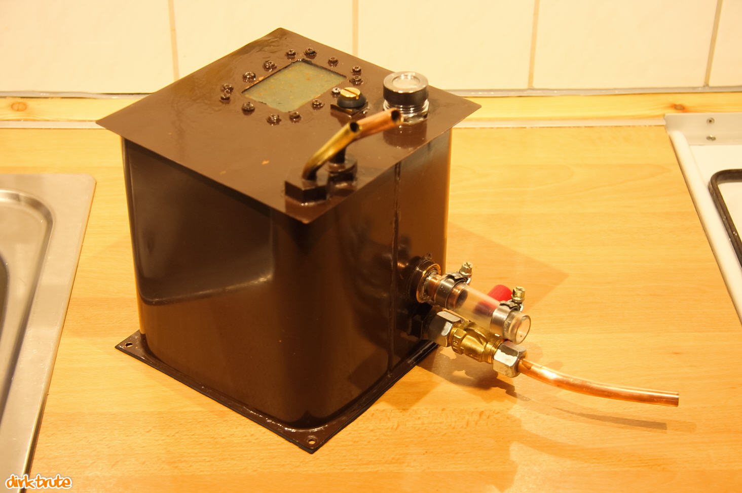 Die Rohranschlüsse wurden zur Verstärkung jeweils mit einer dicken Messingscheibe mit dem Blech des Behälters verbunden. Zuerst werden die Teile des Deckels zusammengelötet. Die Seitenwand besteht aus einem gebogenen Blechstreifen mit einer Bördelung für die Lötverbindung. Der Deckel wird auf das Seitenwandteil gespannt und dann angelötet. Bevor der Behälter geschlossen wird, kann das Sichtfenster bzw. Schauglas eingebaut werden. Dann wird alles auf den Boden gespannt und mit diesem verlötet. Der Behälter erhielt dann noch eine schöne stylishe braune Lackierung.