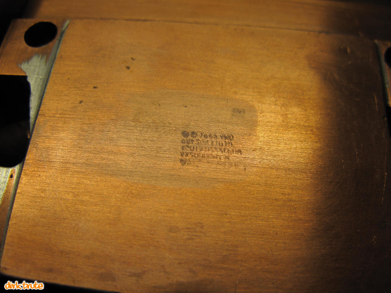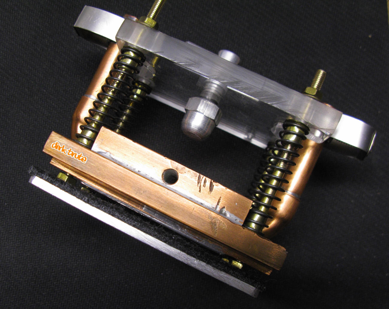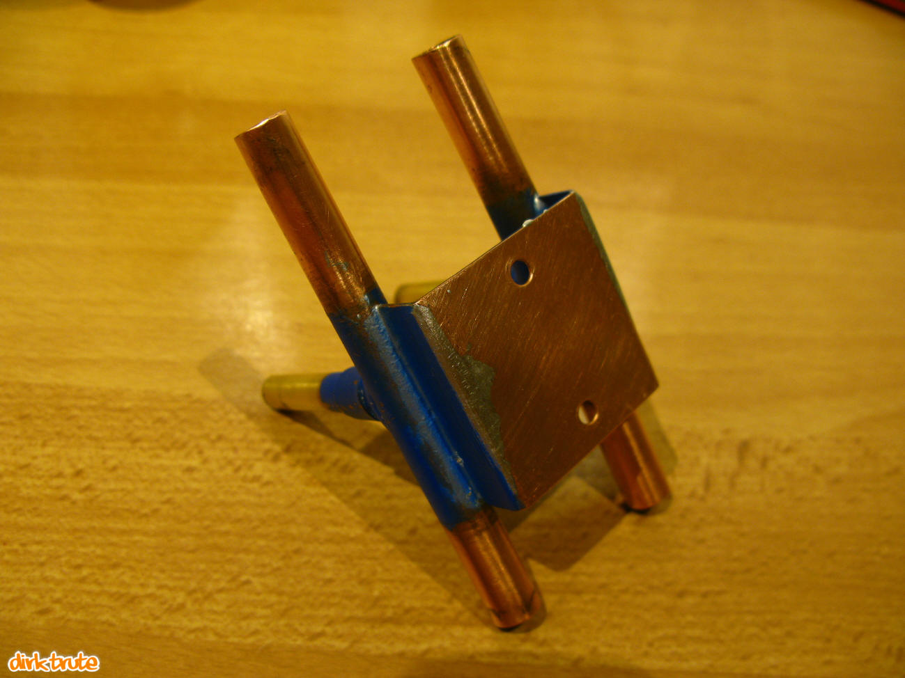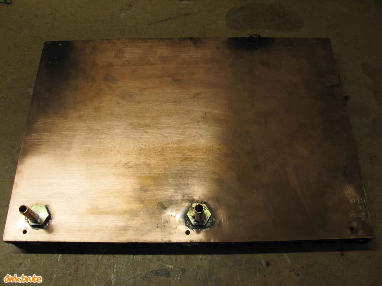 Den Boden bildet ein 1mm starkes Kupferblech, dass auch bereits ein Vorleben in anderer Funktion hatte. Als Leitungsanschlüsse dienen 10mm Kupferrohre mit Bögen aus dem Heizungsbedarf. Alle Teile wurden in einem Arbeitsgang mittels Brenner verlötet. Die Bodenpalte wurde nach den Lötarbeiten mit einer Bandschleifmaschine plan geschliffen.