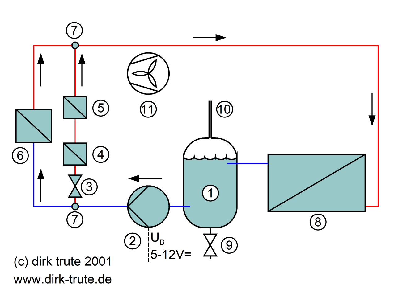 Da Grafikkarte und Northbridge ebenfalls mit nicht gerade leisen Lüftern versehen waren sollte diese gleich mit eliminiert werden. Es wurden also 3 Wärmetauscher als Wasser-Kühler benötigt. Für die Zirkulation sollte eine Pumpe sorgen. Das System sollte einen drucklosen belüfteten Speicher besitzen, von der Funktion ähnlich einer Hydraulikanlagen. Zur Wärmeübertragung zwischen Wasser und Luft sollte ein Radiator eingesetzt werden. Die kleineren Wärmeerzeuger sollten über einen Nebenkreis angeschlossen werden, also benötigte ich noch einen Verteiler. Das einzig neue (glaube ich zumindest) war der Speicher. Auf diesen sind später (…ähm leider) auch noch andere gekommen.