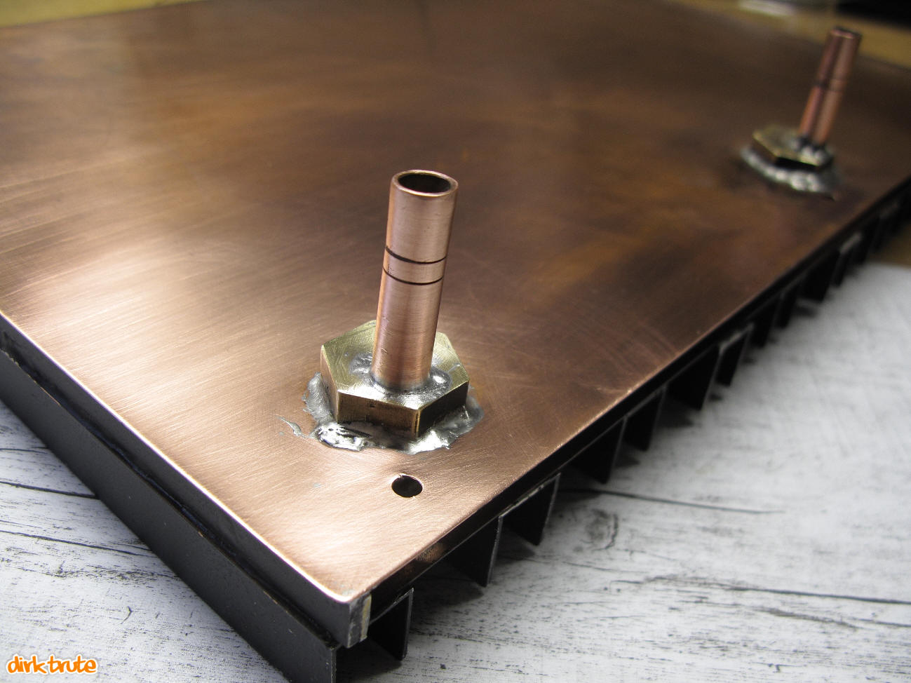Die Innenseite erhielt zwei Schlauchanschlüsse aus Kupferrohr und einer aufgelöteten 4mm Messingscheibe zur Verstärkung.