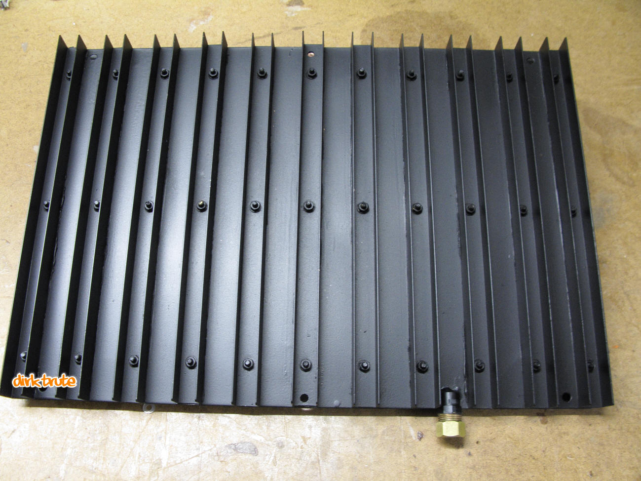 Nach Fertigstellung aller Lötarbeiten und einer Dichtheitsprüfung wurden die Kühlrippen mit einem Zweikomponenten - Wärmeleitkleber auf den Radiator angeklebt. Dieser soll Unebenheiten in der Oberfläche egalisieren und so einen guten Wärmeüberhang herstellen. Die Schrauben zur Befestigung dürfen aber nur mäßig festgezogen werden. Denn nach ganz fest, kommt immer ganz locker.