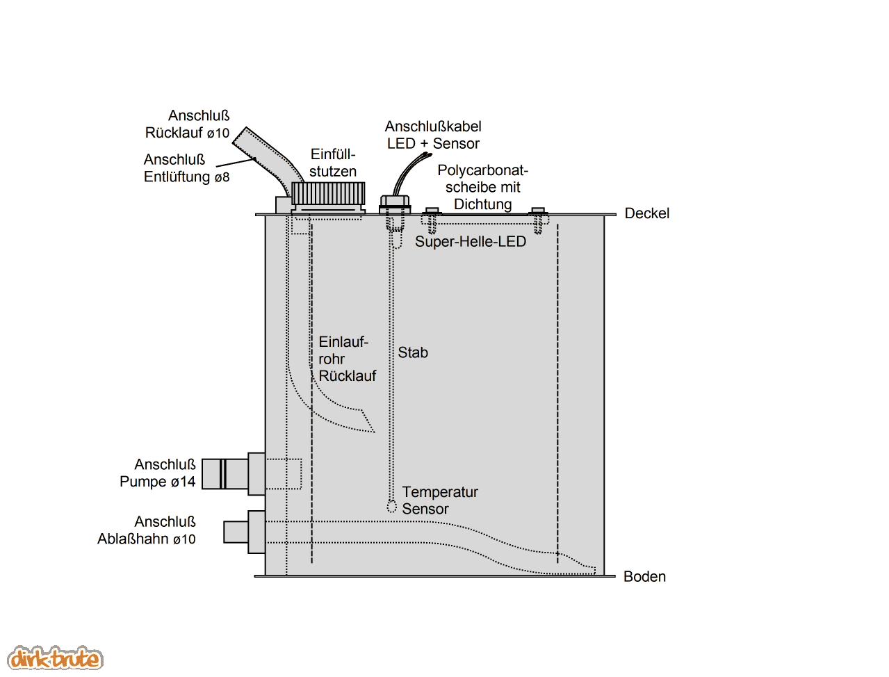Das Ablassrohr sollte besser gleich aus dem Gehäuse führen, z.B. nach unten durch den Boden des PC-Gehäuses.