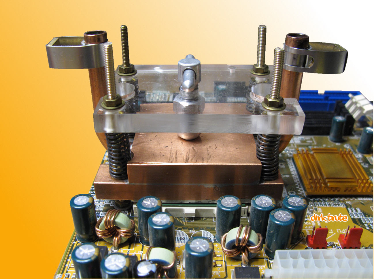 Auf die 4 Stehbolzen wird dann der Wasserkühler für die CPU aufgesteckt. Die Ausrichtung wollte ich über 4 Federn vereinfachen. Wirklich vereinfacht hat die Montage dann eine Anpressschraube oder Spindel direkt über dem Die der CPU (Die = die Glasplatte mit dem CPU-Kern).